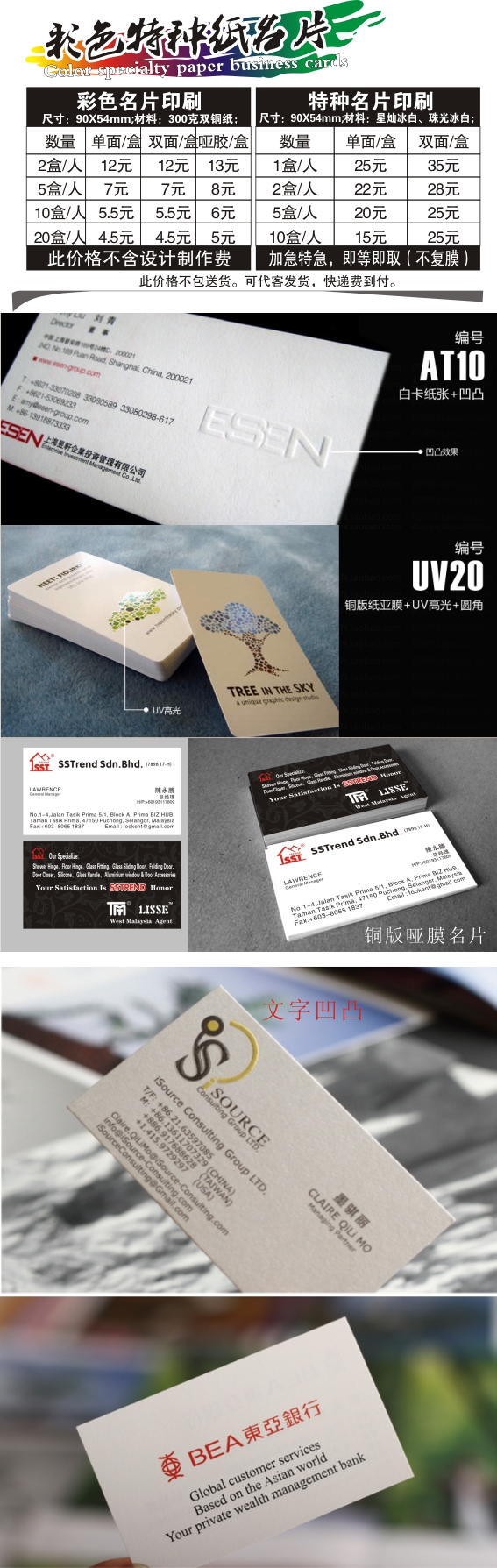 龍緣名片印刷提供銅版紙、荷蘭白、布紋紙、珠光紙、紳士紙、雅紋紙、透明PVC、啞面PVC多種紙張選擇,一百多種高檔特種紙可提供專版印刷;名片制作提供擊凸、凸字、燙金、UV、圓角、異型、窄幅、折疊等工藝加工。